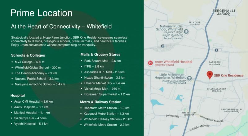 Located in the heart of Whitefield, SBR One Residence enjoys excellent connectivity to major IT and business hubs like ITPL, Hoodi, and KR Puram. The area is also well connected to Old Madras Road and the upcoming metro lines. Nearby, residents have access to reputed schools, healthcare centers, malls, and entertainment zones, all within a 15-minute drive. This makes the project ideal for professionals and families looking to live in a vibrant and well-developed neighborhood.